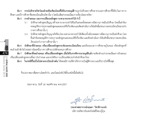474 ข้อ 7 นักศึกษาที่ขอย้ายคณะ หรือเปลี่ยนหลักสูตร เมื่อได้รับการพิจารณาอนุมัติแล้ว จะต้องช�าระค่าธรรมเนียมการย้ายคณะ