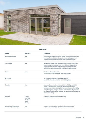 ide-huse4UDVENDIGTNAVNHUSTYPESTANDARDFundament/sokkelAlleFundamenter st%u00f8bes til frostfri dybde. Fundamenter afsluttes med LecaTherm blokke, der pudses med sokkelpuds. Der udf%u00f8res radonsp%u00e6rre/udluftning efter g%u00e6ldende regler.Terr%u00e6nd%u00e6k:AlleTerr%u00e6nd%u00e6k st%u00f8bes med flydebeton der armeres med 6 mm netarmering. Der isoleres med min. 265 mm Ekspanderet Polystyren (EPS) med karakteristisk trykstyrke p%u00e5 80 kPa, lagtykkelse og lambdav%u00e6rdi jf. endelig energiberegning.Kloak:AlleAlt kloak udf%u00f8res til skelstik (op til 15 m fra udv. sokkel er indeholdt i prisen)El & Vand:Alt El & Vand udf%u00f8res til skelstik/kabelskab (op til 15 m fra udv. sokkel er indeholdt i prisen)FacaderAlleFacade udf%u00f8res i teglsten (Afsat bel%u00f8b kr. 7,00 pr. stk. inkl. moms %u2013 Bruttopriser), opmures i l%u00f8berforbandt 1 med funktionsm%u00f8rtel (standard gr%u00e5). Hulmuren isoleres jf. endelig energiberegning. V%u00e6lges mursten som ikke kan afsyres eller der kr%u00e6ves anden m%u00f8rtel, og/eller der %u00f8nskes anden fugefarve vil der v%u00e6re till%u00e6g.FacaderClassic Liva/Vida G%u00e5rdhave Miva FunkisS%u00e5lb%u00e6nke udf%u00f8res som rulleskifte i tegl.Bagmur og Skillev%u00e6ggeAlleBagmur og skillev%u00e6gge opf%u00f8res i 100 mm Porebeton.