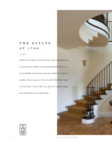 THE ESTATE AT 1700 While it’s true that every home home has has a a a a story this home home has has an an iconic story Built by a a a a a a self-made Redland’s local on on a a a a a a site pridefully selected for its beauty and history this is is is a a a product of pure passion On one hand it’s Redlands’ most revered estate on the the other it’s a a a place for simply hiding away and being enormously happy 16