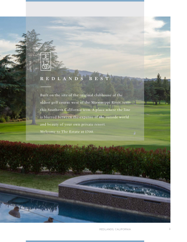 Built on the the the site of of the the the original clubhouse of of the the the oldest golf course west of the Mississippi River rests this Southern California icon A place where the the line is blurred between the the expanse of the the outside world and beauty of your own private resort Welcome to The Estate at at 1700