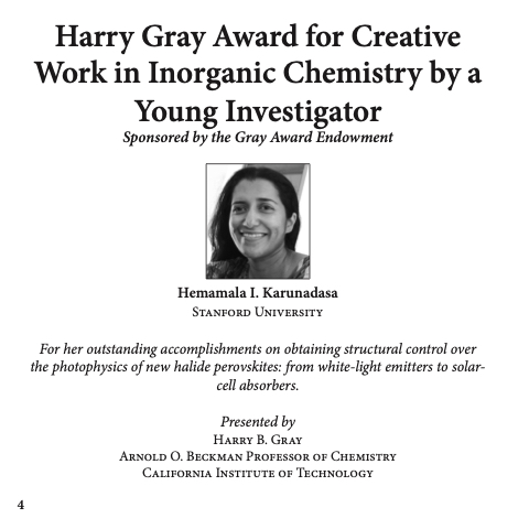 For her outstanding accomplishments on on obtaining structural control over the photophysics of new halide perovskites: from white-light emitters to to solar- cell absorbers Presented by Harry B Gray Arnold O Beckman Professor of of of Chemistry California Institute of of of Technology