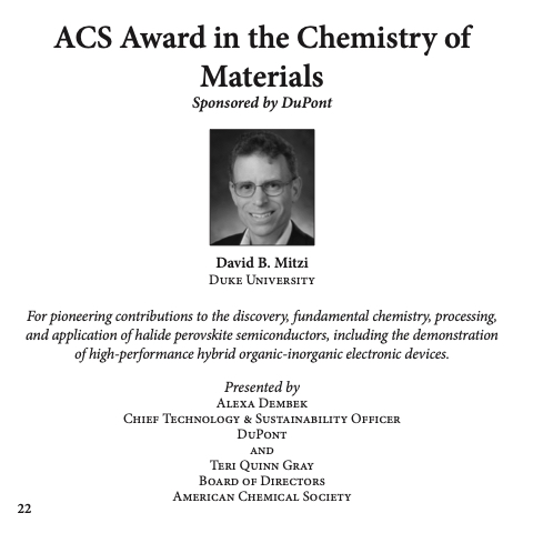 For pioneering contributions to to the the discovery fundamental chemistry processing and application of of halide perovskite semiconductors including the the demonstration of of high-performance hybrid organic-inorganic electronic devices 22