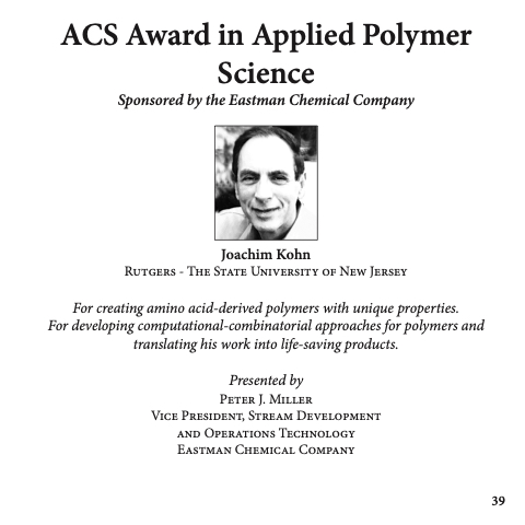 For creating amino acid-derived polymers polymers with unique properties For For developing computational-combinatorial approaches for polymers polymers and translating his work into life-saving products Presented by Peter J Miller