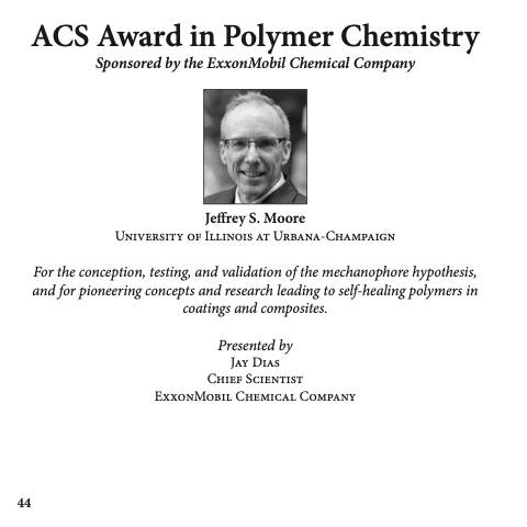 For the the the conception testing and and and validation of the the the mechanophore hypothesis and and and and for pioneering concepts and and and and research leading to self-healing polymers in in in in in in coatings and and composites Presented by Jay Dias