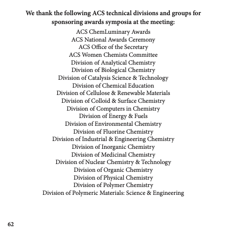 We thank the the following ACS technical divisions and groups for sponsoring awards symposia at the the meeting: