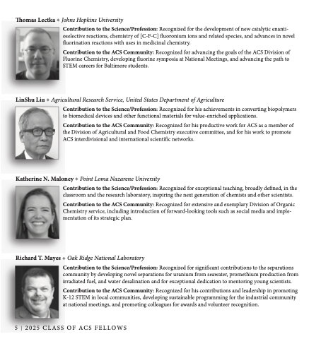Contribution to to the the Science/Profession: Recognized for for significant contributions to to the the separations separations community by developing novel separations separations for for for uranium from from seawater promethium production from from irradiated fuel and and water water desalination and and for for exceptional dedication to to mentoring young scientists Contribution to the the ACS Community: Recognized for for his contributions and leadership in in in in in in in promoting K-12 STEM in in in in in in in in in local communities developing sustainable programming for for for the the industrial community at at national meetings and and promoting colleagues for for awards and and volunteer recognition 5 5 l 2025 CLASS OF ACS FELLOWS