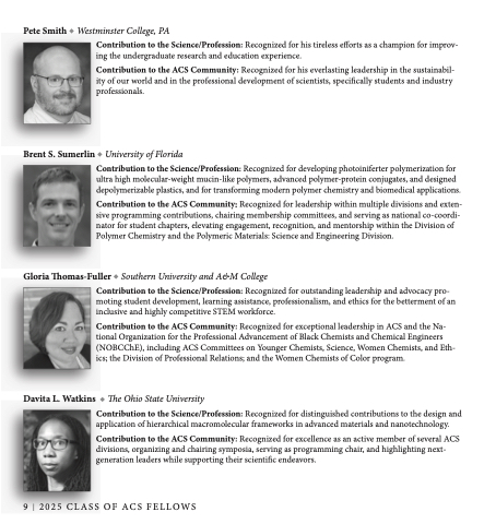 Contribution to to the Science/Profession: Recognized for for developing photoiniferter polymerization for for ultra high molecular-weight mucin-like polymers advanced polymer-protein conjugates and and and designed depolymerizable plastics and and and for for transforming modern polymer polymer polymer polymer chemistry and and and biomedical applications Contribution to the ACS Community: Recognized for leadership within multiple divisions and and exten- sive programming contributions chairing membership committees and and and serving as national co-coordi- nator for student chapters elevating engagement recognition and and and and mentorship within the the Division Division of Polymer Polymer Chemistry and and and the Polymeric Materials: Science and and and Engineering Division Gloria Thomas-Fuller u u u Southern University and A&M College Contribution to the the Science/Profession: Recognized for for outstanding leadership and and and advocacy pro- moting student development learning assistance professionalism and and and and ethics for for for the the betterment of of of an an an an an an inclusive and highly competitive STEM workforce Contribution to the the the ACS ACS Community: Recognized for for exceptional leadership in in ACS ACS and and the the the Na- tional tional Organization for for the the the Professional Advancement of of Black Chemists Chemists Chemists and and and Chemical Engineers (NOBCChE) including ACS Committees on on on on on on on Younger Chemists Chemists Chemists Chemists Science Women Women Chemists Chemists Chemists Chemists and and and Eth- ics the the Division of of of Professional Relations and the the Women Women Chemists Chemists Chemists of of of Color program Davita L Watkins u The Ohio State University Contribution to to the the Science/Profession: Recognized for distinguished contributions to to the the design and and application of of hierarchical macromolecular frameworks in in advanced materials and and nanotechnology Contribution to the ACS ACS Community: Recognized for excellence as as an an an an active member of several ACS ACS divisions organizing and and chairing symposia serving as as programming chair chair and and highlighting next- generation leaders while supporting their scientific endeavors 9 l 2025 CLASS OF ACS FELLOWS