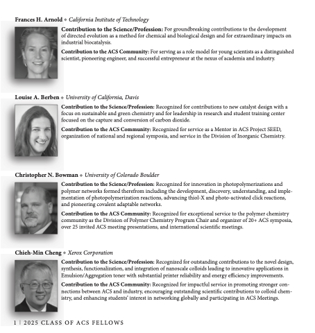 Contribution to to to the the the Science/Profession: Recognized for outstanding contributions to to to the the the novel design synthesis functionalization and and and integration of of nanoscale colloids leading to to to to innovative applications in in in in in in Emulsion/Aggregation toner with substantial printer reliability and and energy efficiency improvements Contribution to to the ACS ACS Community: Recognized for impactful service in in in in in promoting stronger con- nections between ACS ACS ACS and and and and industry encouraging outstanding scientific contributions to to colloid chem- istry and and and and enhancing students’ interest in in in in in in in in in in networking globally and and and and participating in in in in in in in in in in ACS ACS Meetings 1 l 2025 CLASS OF ACS FELLOWS