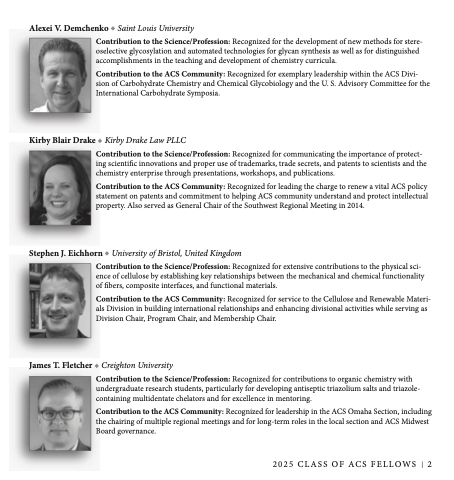 Contribution to to the the the Science/Profession: Recognized for extensive contributions to to the the the physical sci- ence ence of of of cellulose by establishing key relationships between the the the mechanical and and chemical functionality of of fibers composite interfaces and functional materials Contribution to to the the ACS Community: Recognized for service to to the the Cellulose and and Renewable Materi- als Division Division in in in in in building international relationships and and and enhancing divisional activities while serving as Division Division Chair Chair Chair Program Chair Chair Chair and and Membership Chair Chair Chair James T Fletcher u Creighton University Contribution to to the Science/Profession: Recognized for for contributions to to organic chemistry with undergraduate research students particularly for for for developing antiseptic triazolium salts and and triazole- containing multidentate chelators and for for excellence in in in in in mentoring Contribution to the the the the ACS ACS ACS Community: Recognized for for leadership in in in in in in the the the the ACS ACS ACS Omaha Section including the the the the chairing of multiple regional meetings and and for for long-term roles in in in in in in the the the the local section and and ACS ACS ACS Midwest Board governance 2025 CLASS OF ACS FELLOWS
