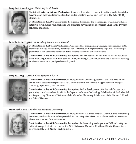 Contribution to the Science/Profession: Recognized for pioneering research and industrial imple- mentation of of of sustainable supercritical fluid solvents across a a a a a a a a a a a a a a a a a a multitude of of of applications in in in in analytical chemistry separations and reactions Contribution to the the the ACS Community: Recognized for his development of of industrial-focused pro- gramming as as well as as leadership within the the the the the Separation Science Technology Subdivision Subdivision of of of the the the the the Industrial and and and Engineering Chemistry Chemistry Division Division and and and the the the the Cannabis Chemistry Chemistry Subdivision Subdivision of of the the the the Chemical Health and and Safety Division Mary Beth Koza u North Carolina State University Contribution to the the the Science/Profession: Recognized for for sustained EHS and and and and chemical safety safety leadership in in in industry and and and and and academia that has provided for for the the the the safety safety of of of workers and and and and and students and and and and and the the the the protection of communities and and the environment Contribution to the the ACS ACS Community: Recognized for leadership and and and support of of DEI and and and safety ini- tiatives through dedicated service on on on on on on the the the ACS ACS ACS Division of of Chemical Health and and and and Safety Committee on on on on on on Science and the the ACS ACS North Carolina Section 2025 CLASS OF ACS FELLOWS
