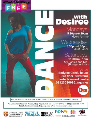 THIS BUSINESS BELONGS TO MRS DESIREE SHAREEF– PARENT TO AYLA AND AMANI SHAREEF 95, Aminu Kano Crescent, Wuse 2, Abuja Nigeria. Tel +234 (0) 929 177 43 / +234 (0) 809 755 7498 Email : headmasterspa@abujaprep.com Web: www.abujaprep.com