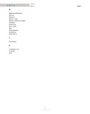 s a i c e INDEX W Waterberg Biosphere Welkom Wepener Western Cape Western Deep No.3 Shaft Westgate Wilderness Wine cellars Wits Witwatersrand Wolwedans World War II Y Yellowwood Z Zimbabwe ruins Zuikerbos Zulu 1