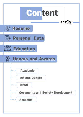 สำรบัญ Resume Personal Data Education Honors and Awards Academic Art and Culture Moral Community and Society Development Appendix