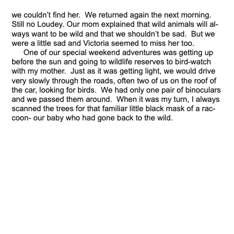 we couldn’t find her. We returned again the next morning. Still no Loudey. Our mom explained that wild animals will al- ways want to be wild and that we shouldn’t be sad. But we were a little sad and Victoria seemed to miss her too.