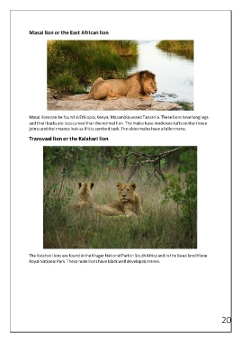 The Kalahari lions are found in the Kruger National Park in South Africa and in the Swaziland Hlane