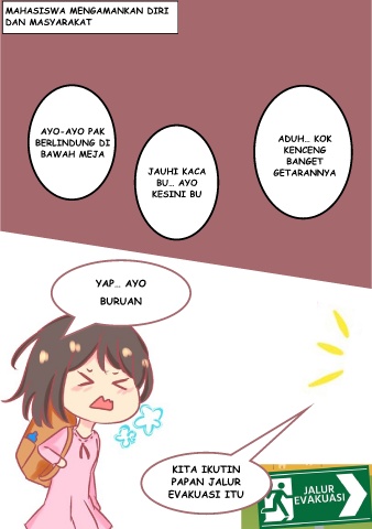 MAHASISWA MENGAMANKAN DIRI DAN MASYARAKAT AYO-AYO PAK BERLINDUNG DI ADUH… KOK BAWAH MEJA KENCENG BANGET JAUHI KACA GETARANNYA BU… AYO KESINI BU YAP… AYO BURUAN KITA IKUTIN PAPAN JALUR EVAKUASI ITU