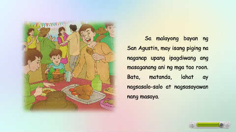 Sa malayong bayan ng San Agustin, may isang piging na naganap upang ipagdiwang ang masaganang ani ng mga tao roon. Bata, matanda, lahat ay nagsasalo-salo at nagsasayawan nang masaya.