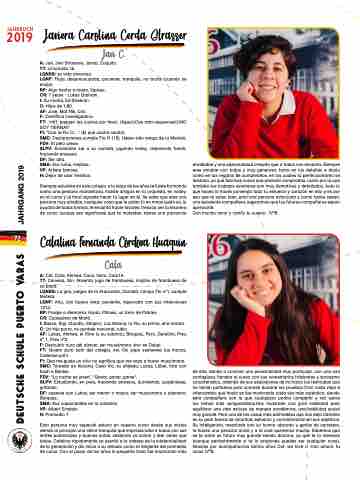 de ella, dando a conocer una personalidad muy particular, con una risa contagiosa, llenaba al curso con sus comentarios hilarantes y sarcasmo característico, además de sus explosiones de ira hacia los resfriados que no tenían pañuelos para sonarse durante las pruebas. Con cada viaje e intercambio que hacía se iba mostrando cada vez más auténtica, siendo esta compañera con la que cualquiera podría compartir y reír sobre los temas más vanguardistas.Has mostrado una gran habilidad para equilibrar una vida exitosa de manera académica, una habilidad social muy grande. Pero una de las cosas más admirables que nos deja Catalina es su gran fuerza de voluntad, esfuerzo y concentración en sus objetivos. Su inteligencia, mezclada con su humor absurdo y ganas de carretear, la hacen una persona única y a la cual queremos mucho. Sabemos que se te viene un futuro muy grande siendo doctora, ya que te lo mereces (aunque perfectamente si te lo propones puedes ser cualquier cosa). Gracias por acompañarnos tantos años Cat, we love u. Con amors, tu curso IV°B.