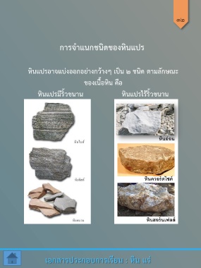 ๓๒ การจ าแนกชนิดของหินแปร หินแปรอาจแบ่งออกอย่างกว้างๆ เป็น ๒ ชนิด ตามลักษณะ ของเนื้อหิน คือ หินแปรมีริ้วขนาน หินแปรไร้ริ้วขนาน หินอ่อน หินควอร์ตไซต์ หินฮอร์นเฟลส์ เอกสารประกอบการเรียน : หิน แร่