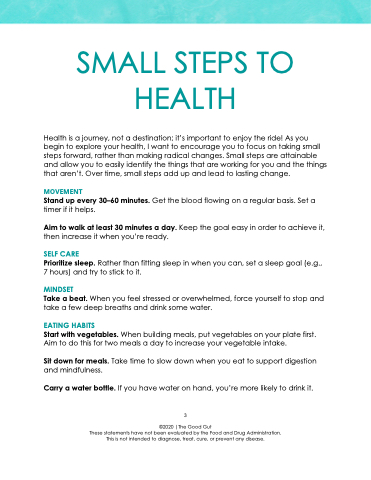 Health is a journey, not a destination; it’s important to enjoy the ride! As you begin to explore your health, I want to encourage you to focus on taking small steps forward, rather than making radical changes. Small steps are attainable and allow you to easily identify the things that are working for you and the things that aren’t. Over time, small steps add up and lead to lasting change.