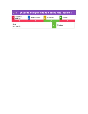 Q13 ¿Cuál de los siguientes es el activo más "líquido"? "Materias ■ ▲ ♦ "Empleados" ● "Efectivo" "Local" primas" ✘ ✘ ✔︎ ✘ José ✔︎ Efectivo monsivais