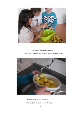 Peel the potatoes and the onoins. Schäle die Kartoffeln und ziehe die Schale der Zwiebel ab. Wash the potatoes and the onions. Wasche die Kartoffeln und die Zwiebel. 39