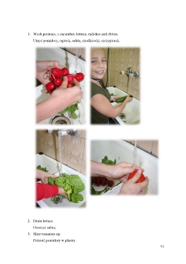 1. Wash potatoes, a cucumber, lettuce, radishes and chives. Umyć pomidory, ogórek, sałatę, rzodkiewki, szczypiorek. 2. Drain lettuce. Osuszyć sałatę. 3. Slice tomatoes up. Pokroić pomidory w plastry. 74