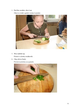 4. Peel the cucmber, slice it up. Obrać ze skórki ogórek, kroimy w plastry. 5. Slice radishes up. Pokroić w plastry rzodkiewki. 6. Chop chives finely. Pokroić na drobno szczypiorek. 75