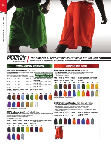 • 7”, 9”, 11” inseam (6” for Youth, 5" for Women's, 4" for Girls') VISIT ALLESONATHLETIC.COM 5069P Adult 9” inseam S-XXXL List: $9.50, $11.20 (XXL), $13.00 (XXXL) • Three-needle cover stitched throughout for appearance, comfort and durability • 90% polyester/10% spandex eXtreme pin dot mesh Cationic colorfast polyester with moisture