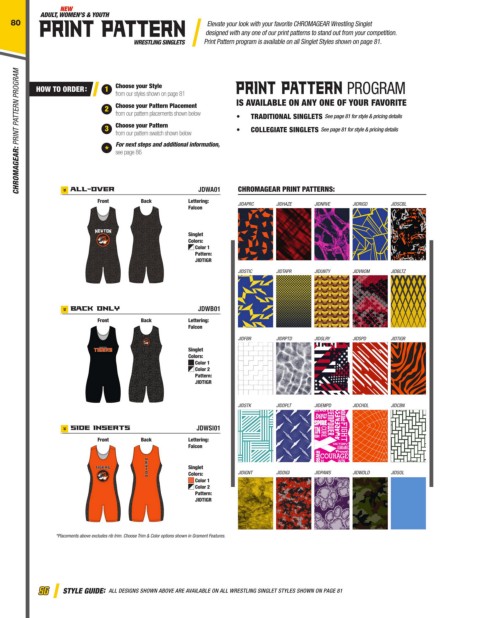 CHROMAGEAR: PRINT PATTERN PROGRAM * from our styles shown on page 81 IS AVAILABLE ON ANY ONE OF YOUR FAVORITE GARMENT FEATURES: CHROMAGEAR WRESTLING SINGLETS SEE PAGE 96 CHROMAGEAR: SINGLETS STYLE GUIDE