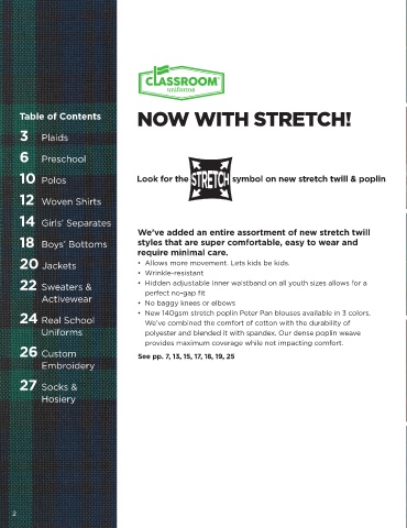 We’ve added an entire assortment of new stretch twill • Growth features such as adjustable