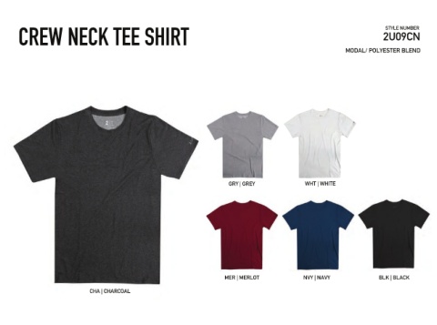 CREW NECK TEE SHIRT 2U09CN STYLE NUMBER MODAL/ POLYESTER BLEND GRY | GREY WHT | WHITE MER | MERLOT NVY | NAVY BLK | BLACK CHA | CHARCOAL