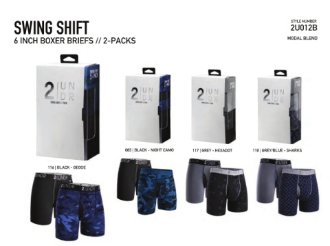 SWING SHIFT STYLE NUMBER 2U012B 6 INCH BOXER BRIEFS // 2-PACKS MODAL BLEND 083 | BLACK - NIGHT CAMO 117 | GREY 118 | GREY/BLUE - SHARKS 117 | GREY - HEXADOT 116 | BLACK - GEODE