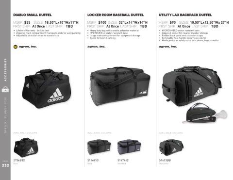 • Zippered main compartment that opens wide for easy packing • HYDROSHIELD water-resistant base • Zippered pocket for cleat or sneaker storage