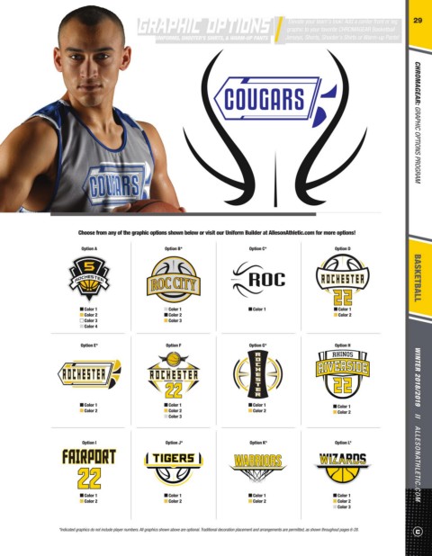 Color 3: ----- STYLE GUIDE:  ALL DESIGNS SHOWN ABOVE  ARE AVAILABLE ON ALL UNIFORM, SHOOTER’S SHIRT, WARM-UP PANT & HEADBAND STYLES SHOWN ON PAGES 15, 23 & 27   *Indicated graphics do not include player numbers. All graphics shown above are optional. Traditional decoration placement and arrangements are permitted, as shown throughout pages 6-28.