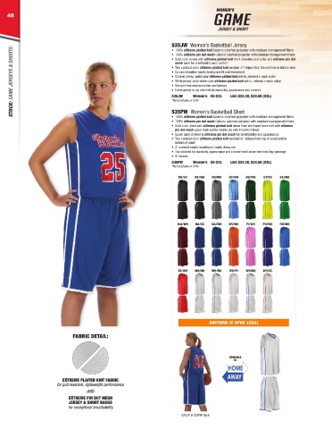 STOCK: GAME JERSEYS & SHORTS • Two contrast color eXtreme plaited knit overlaid ½” stripes from the armhole to bottom hem BREATHABLE PERFORMANCE • Slim fit silhouette to enhance movement List: $18.00, $20.00 (XXL) STOCK: GAME JERSEYS & SHORTS