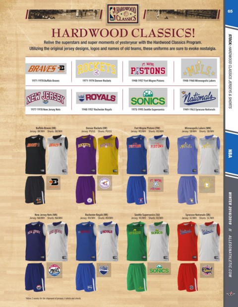 New Jersey Nets H H H Fort Wayne Pistons Hardwood Classicardwood Classicardwood Classicardwood Classic Minneapolis Lakers Hardwood Classicardwood Classicardwood Classicardwood Classic Syracuse Nationals Seattle Supersonics Home Away Home Bu alo Braves Rochester Royals Denver Rockets