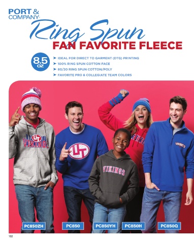 FAN FAVORITE FLEECE 8.5 ➤ IDEAL FOR DIRECT TO GARMENT (DTG) PRINTING oz ➤ 100% RING SPUN COTTON FACE ➤ 80/20 RING SPUN COTTON/POLY ➤ FAVORITE PRO & COLLEGIATE TEAM COLORS PC850ZH PC850 PC850YH PC850H PC850Q 132