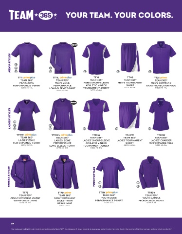We make every effort to color match across the entire Team 365® line. However, it is not possible to guarantee perfect color matching due to the number of fabrics, textures and dye lots in production.