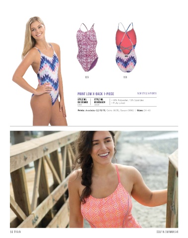 605 998 Print low x-back 1-Piece NEW Style & PRINTS! STYLE NO. STYLE NO. • 91% Polyester / 9% Spandex 6510Cairo 6510saxen • Fully Lined Cairo saxen Prints: Available 02/15/19; Cairo (605), Saxen (998) | Sizes: 24-40 56 TRAIN DOLFIN SWIMWEAR