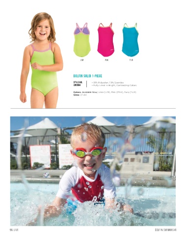 LIM PNK TUR dolfin SOLID 1-piece STYLE NO. • 91% Polyester / 9% Spandex LD9504 • Fully Lined in Bright, Contrasting Colors Colors: Available Now; Lime (LIM), Pink (PNK), Turq (TUR) Sizes: 2T-6X 96 LIVE DOLFIN SWIMWEAR