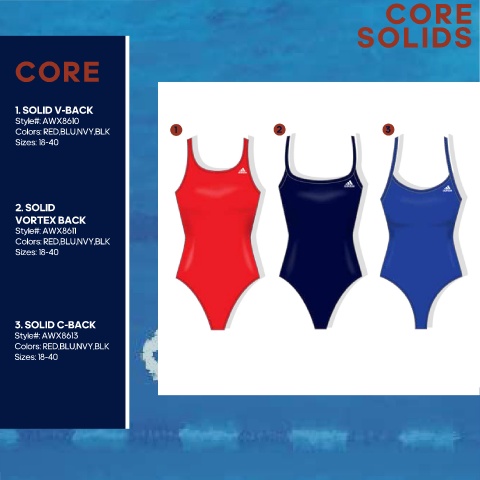 CORE SOLIDS CORE 1. SOLID V-BACK Style#: AWX8610 Colors: RED,BLU,NVY,BLK 1 2 3 Sizes: 18-40 2. SOLID VORTEX BACK Style#: AWX8611 Colors: RED,BLU,NVY,BLK Sizes: 18-40 3. SOLID C-BACK Style#: AWX8613 Colors: RED,BLU,NVY,BLK Sizes: 18-40 CORE