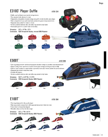 • Vented main compartment • Duffle used by Easton sponsored college teams