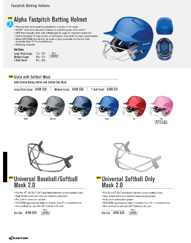 Alpha with Softball Mask • Classic style skull cap which can be worn frontward or backward • Fits all Easton batting and catcher’s helmets