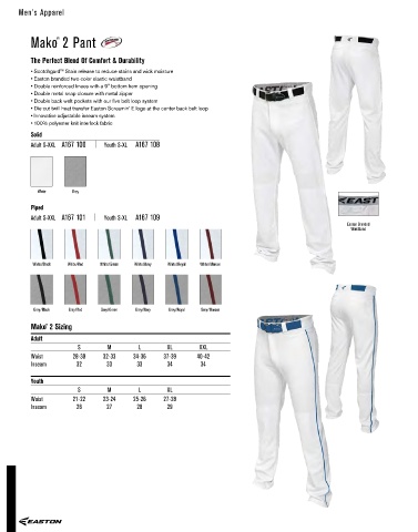 • Scotchgard™ Stain release to reduce stains and wick moisture • Easton branded two color elastic waistband