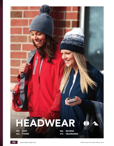 HEADWEAR 458 CAPS 466 BEANIES 463 VISORS 473 HEADBANDS 456 augustasportswear.com Prices subject to change without notice