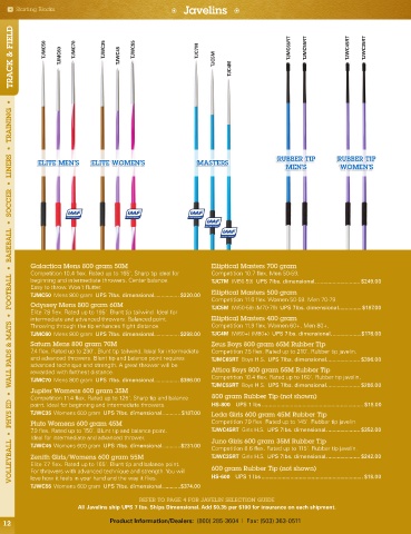 TJWC45 Womens 600 gram UPS 7lbs. dimensional. ...........$231.00 Competition 8.6 flex. Rated up to 115'. Rubber tip javelin.
