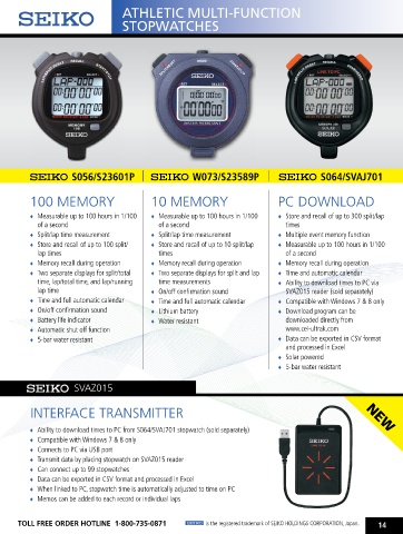 ♦ ♦ ID No. function useful for keeping the time, lap/total time, and lap/running ♦ ♦ Ability to download times to PC from S064/SVAJ701 stopwatch (sold separately)