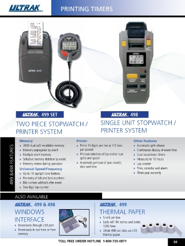 ♦ ♦ Up to 99 waves in multiple start race ♦ ♦ Pause printing function allows for paper change 499 &498 fEATURES ♦ ♦ Memory review during operation ♦ ♦ Automatic printout of year, month, ♦ ♦ Lap counter