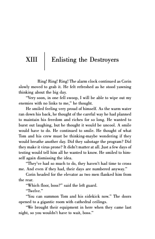 He smiled feeling very proud of himself. As the warm water ran down his back, he thought of the careful way he had planned to maintain his freedom and riches for so long. He wanted to burst out laughing, but he thought it would be uncool. A smile would have to do. He continued to smile. He thought of what Tom and his crew must be thinking-maybe wondering if they would breathe another day. Did they sabotage the program? Did they make it virus prone? It didn’t matter at all. Just a few days of testing would tell him all he wanted to know. He smiled to him- self again dismissing the idea.